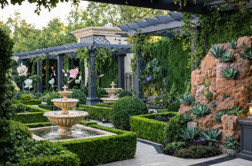 We design and fabricate custom outdoor décor elements including garden props, fountains, sculptures, hedging, topiaries, floral sculptures, gazebos, pergolas, trellises...