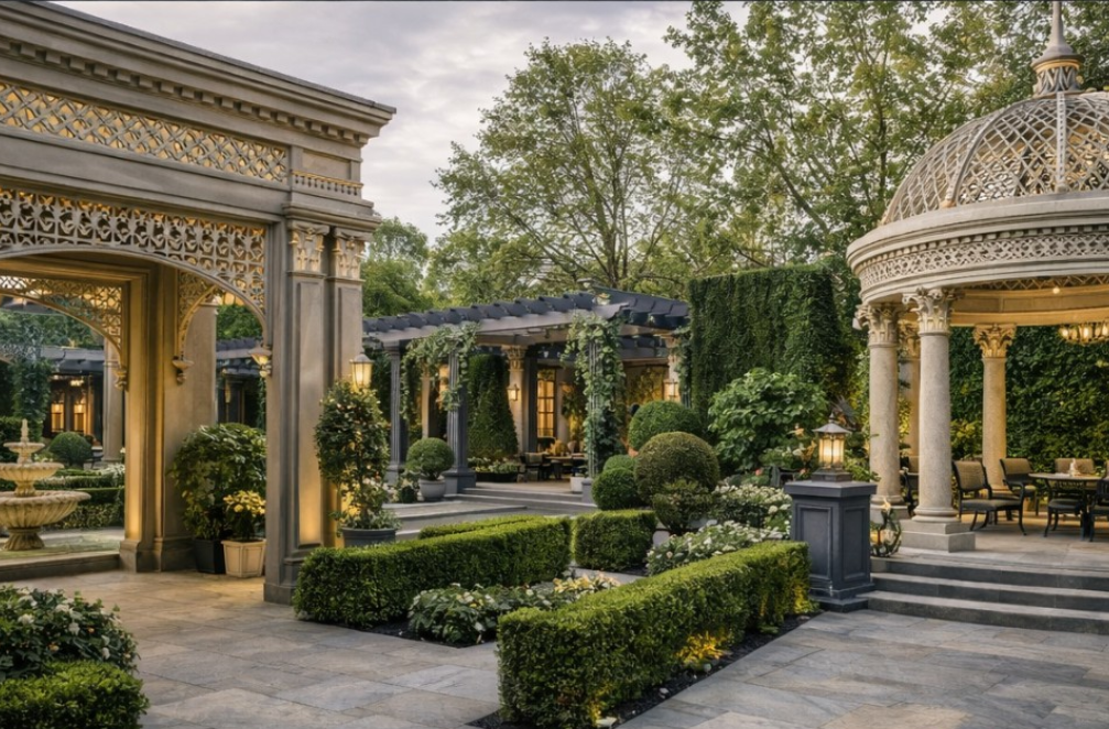 We design and fabricate custom outdoor décor elements including garden props, fountains, sculptures, hedging, topiaries, floral sculptures, gazebos, pergolas, trellises, vertical green walls, and rock and succulent walls. Each installation is crafted to enhance spatial character while ensuring durability and weather resistance.
